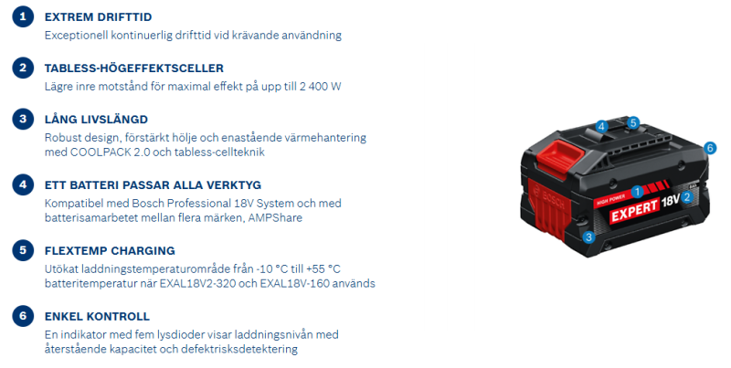 Högeffektsbatteriet EXBA18V-80 ger upp till 120 % längre drifttid för exceptionellt kontinuerligt arbete även vid krävande användning (jämfört med Professional GBA 18V 4.0Ah, data från interna labbtester; slipning på mjukt stål med GWS 18V-15 S + lamellrondell, 30 s-intervaller med 5 s-pauser). Det använder avancerad tabless-cellteknik för en maximal effekt på upp till 2 400 W (data från interna labbtester; omedelbar maximal effekt, fulladdat, nytt batteri).