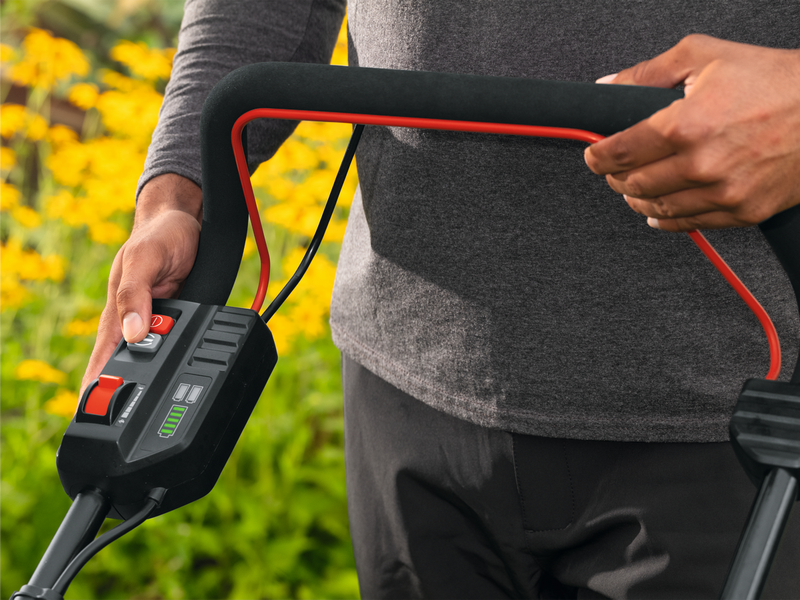 Det hopfällbara handtaget gör att gräsklipparen kan fällas ihop för enkel transport, och gör det möjligt att förvara gräsklipparen i vertikalt läge. Det ergonomiska handtaget med soft grip kan höjdjusteras i två nivåer och gör att du kan arbeta i en mer hälsosam ställning med mindre trötthet.
