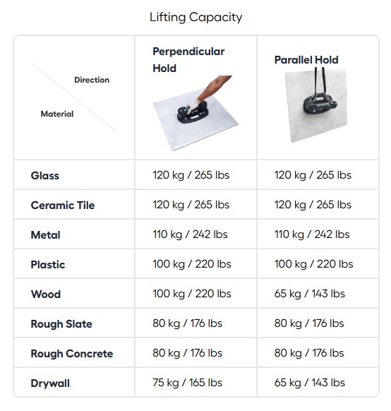 - Stor LED-display med val av olika enheter (kg/bar/lb/psi) och justerbar vakuumnivå, vilket gör det enkelt att anpassa lyftet till olika material, från robust natursten till känsligt glas.