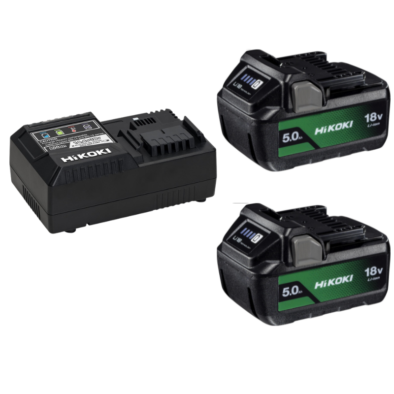 Laddpaket från Hikoki med Li-Ion batterier på 5,0Ah för 18V Sladdlösa maskiner med Slide batterifäste samt snabbladdare.