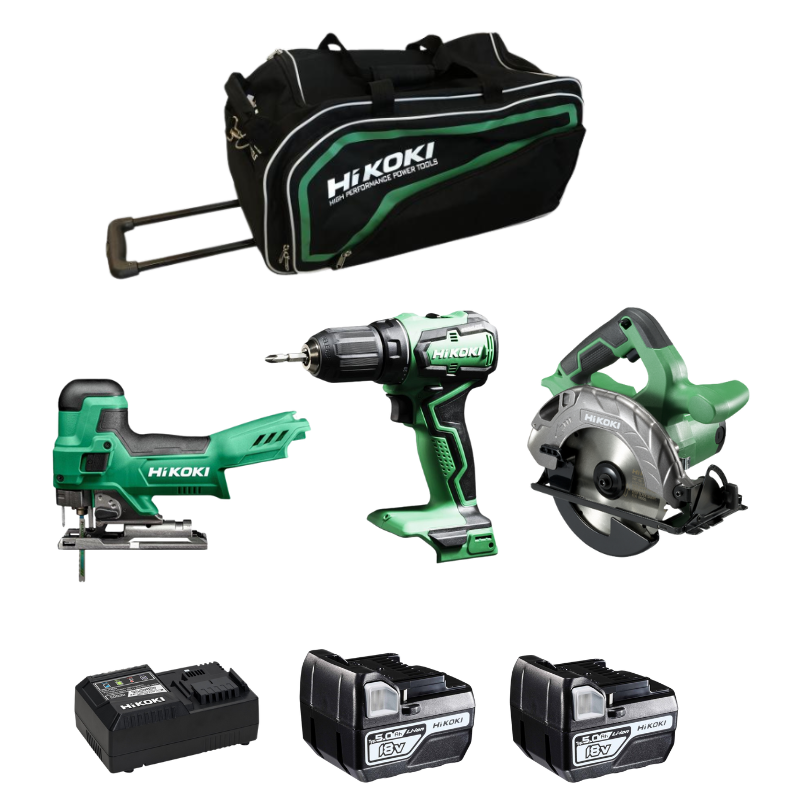 Prispressat 18V verktygspaket från HiKOKI som innehåller skruvdragare, sticksåg. cirkelsåg, två batterier och en laddare.
