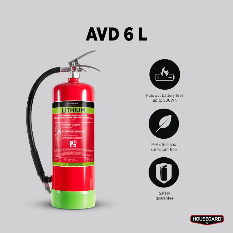 Housegard 6 liters AVD brandsläckare är lämplig att använda mot bränder i litiumjonbatterier och fasta metaller.