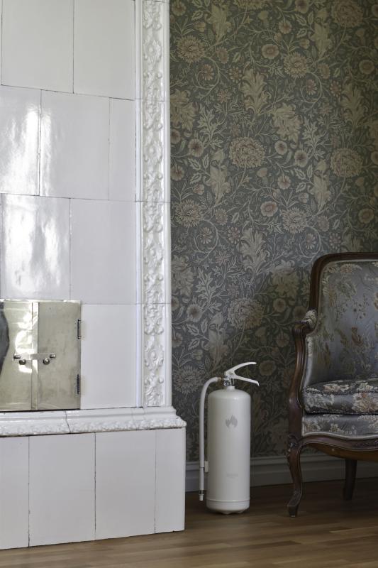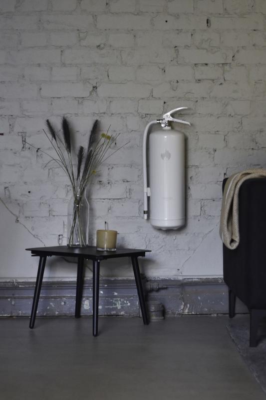 Den vita brandsläckaren smälter in i hemmet och blir en del av inredningen.