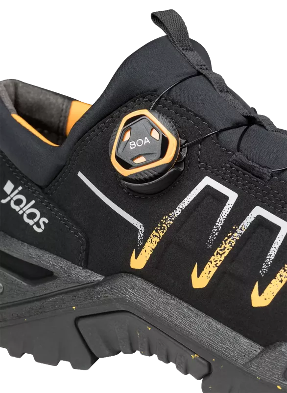 BOA® Fit System (från återvunnet material) på sidan eliminerar tryckpunkter. Aluminiumtåhätta och återvunnet metallfritt spiktrampskydd, Vibram® återvunnen nitrilgummisula med bra grepp.
