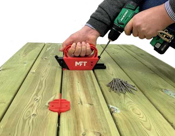 Montaget sker tillsammans med MFT special anpassade TX15 bits och MFT special designade rostfri syrafasta trallskruv. Skänklarna som klämmer om trallbrädan ger en distans mellan varje trallbräda på 2,5 mm, om annat avstånd önskas så medföljer det 2st avståndsmått i varje förpackning.