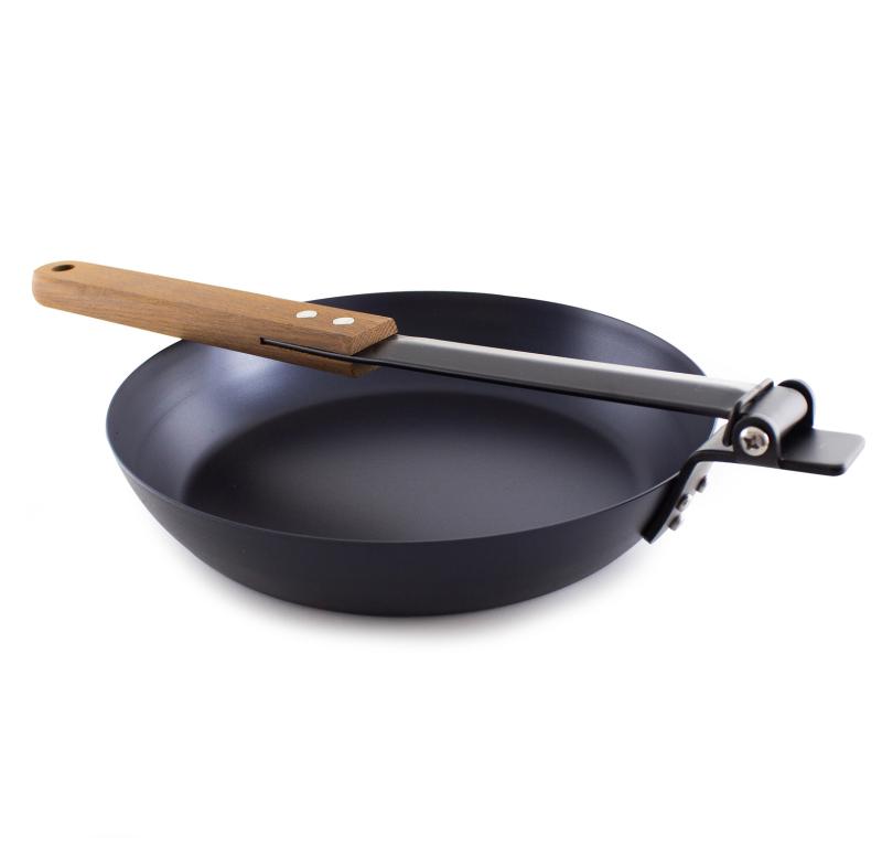 Praktisk och lätt jägarstekpanna av kolstål med hopfällbart handtag.