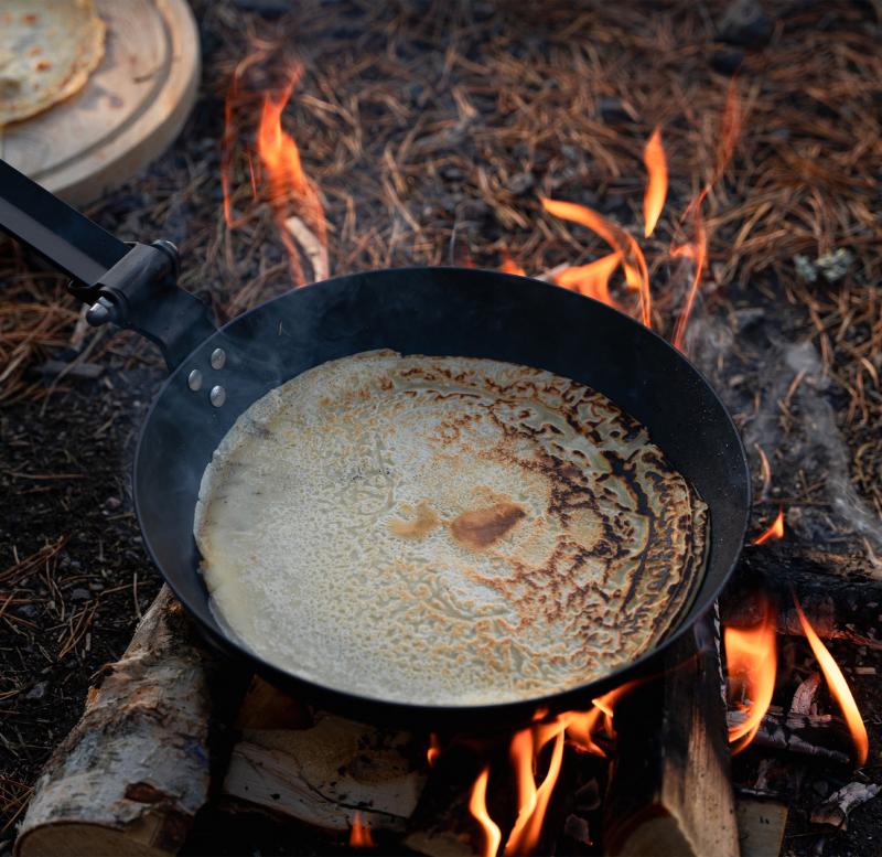 Jägarstekpanna som är tillverkad av kolstål och har ett hopfällbart handtag. Perfekt när du lagar mat över öppen eld, och tack vare det långa ergonomiska handtaget slipper du komma för nära glöden.