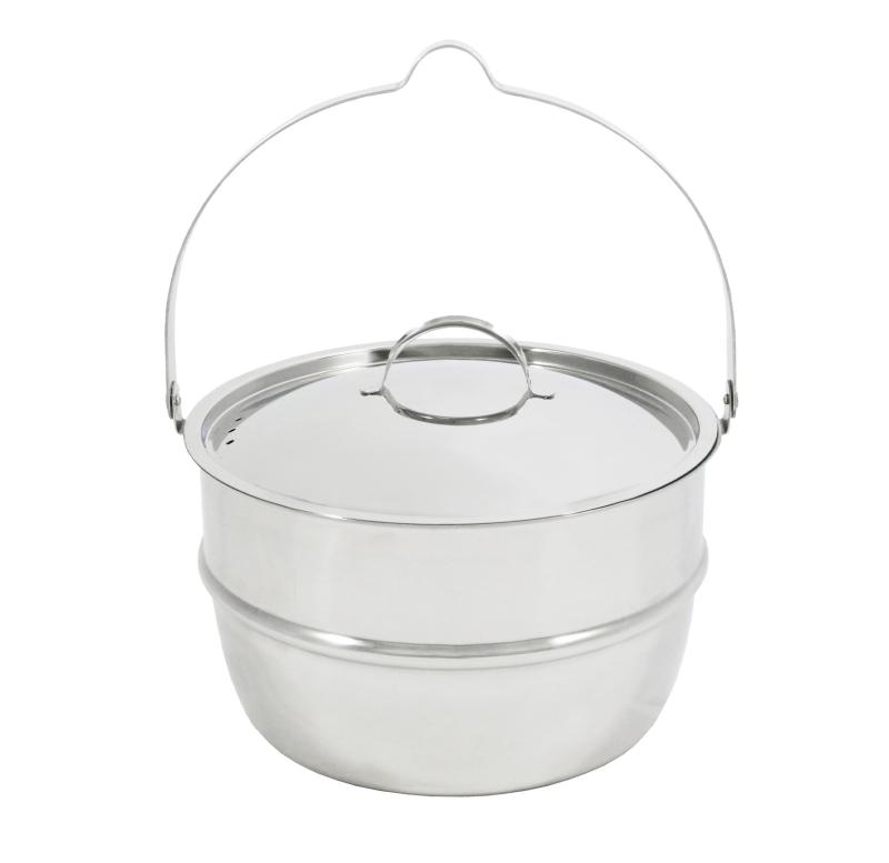 För utomhusbruk. Handtagets form gör den lätt att hänga över öppen eld. Kan också användas på gasolgrillen och vildmarksköket.