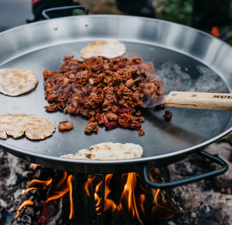 Paellapanna av kallvalsat stål. Med platt botten och kant som håller maten på plats. Perfekt för gasolbrännare eller öppen eld.