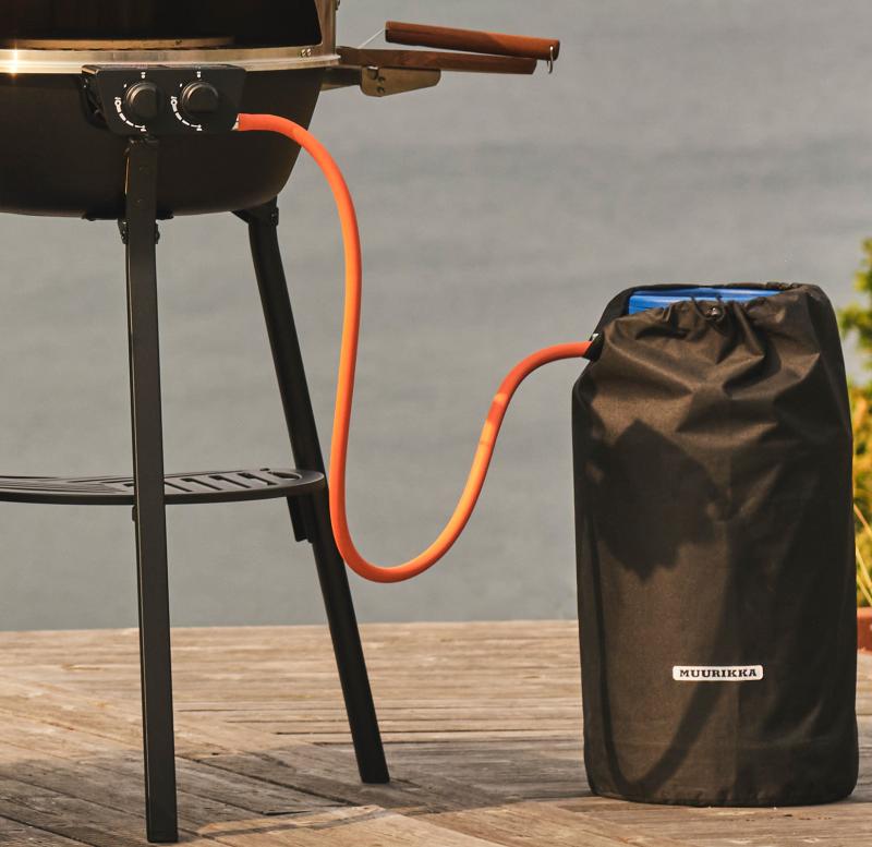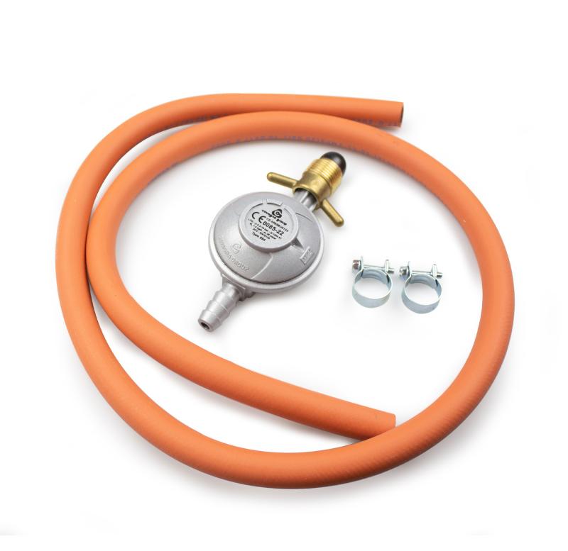 Regulatorset för svenska gasolflaskor. Regulator 29 mBar, 1,2 meter slang, Ø 10 mm, och 2 st slangklämmor.