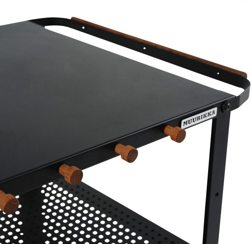 Stekhällsset 58 WG har smarta förvaringslösningar med hyllor i två nivåer och fyra krokar i FSC-certifierad rökt ask, så att redskapen alltid finns nära till hands. Draghandtaget i samma material gör vagnen lätt att flytta och kan även användas för att hänga handduk eller grilltång. Hjulen går att fästa på båda sidorna. Sätt hjulen där det är som tyngst för att den ska bli enkel att flytta. Materialet på vagnen och skruvarna är stål.