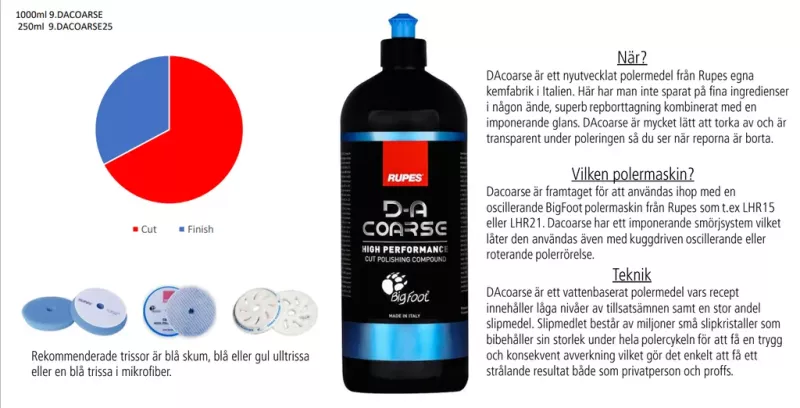 D-A COARSE High performance cut polishing compound är designat för maximal effektivitet. Blå färg hos Rupes är synonymt med hög avverkning, dvs används ofta som ett första steg för att ta bort repor fort på ett objekt i skadat/slitet skick.